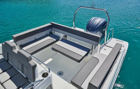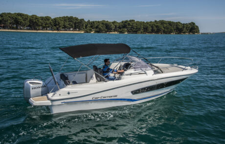 The Cap Camarat 7.5 WA is a sporty and versatile motorboat from Jeanneau. With its 7.37 meters in length, it offers a large, modular cockpit, a forward sunbathing area, and a small cabin with sleeping accommodations. Perfect for cruising, fishing, or water sports, it can accommodate up to 8 people and is equipped with a 225 HP outboard engine. Comfortable, safe, and easy to handle, it’s the ideal boat for enjoying the sea with family or friends.