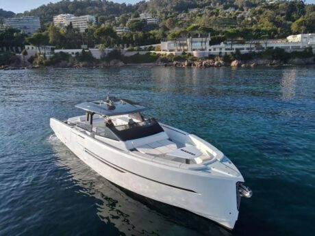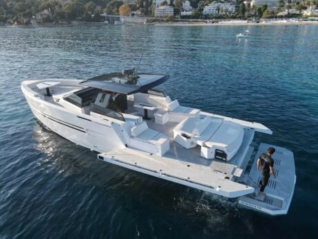 Modern and aesthetic, our new Okean 55 is the perfect yacht for day charters on the French Riviera. Equiped with stabilizers who guarantees great comfort at anchor, and with an advanced technology which allows to expand the sides of the boat, the Okean and her very large back platform will delight groups of friends and families willing to enjoy good times onboard this summer. Don’t hesitate anymore, this yacht is made for you !